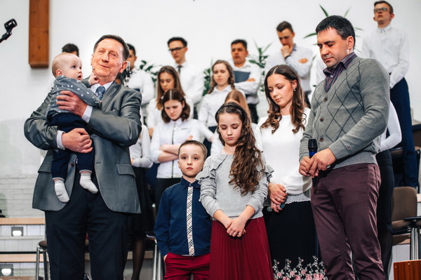 Наш пастор (и по совместительству дедушка Матвейки) Виктор Никодимович Крутько перед молитвой над малышом прочитал Евангелие от Луки 18:15 и говорил о том, что когда верующие просят у Господа благословить их ребенка, они просят о самом главном - не о карьере, не об успехе, но о благословении познанием Бога.