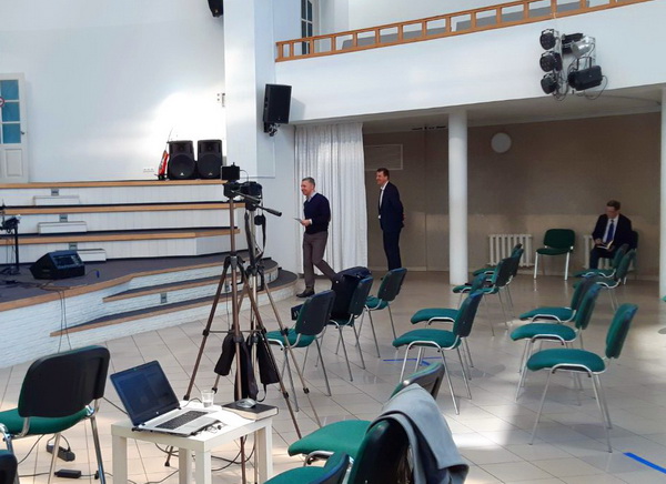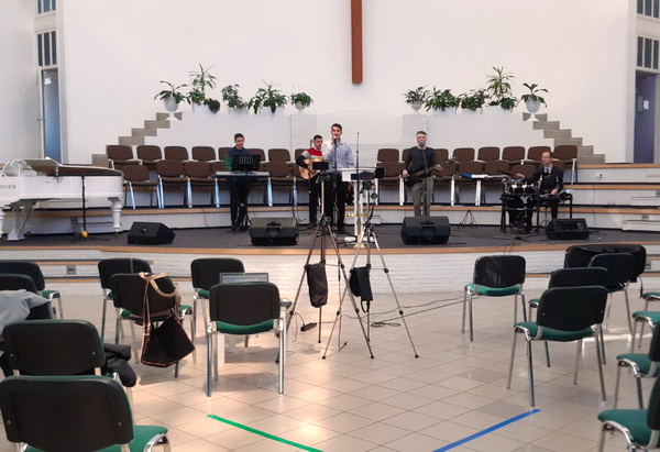 Заходим в зал. Музыкальная группа уже вовсю разыгрывается на сцене, чтобы отрепетировать все выбранные песни для общего пения и сольные номера, ведь все репетиции среди недели были отменены из-за эпидемиологической обстановки в мире и стране. Сегодня впервые в истории нашей церкви (наверное, мы в этом не одиноки), служение проходит в online-режиме, при пустом зале. Итак, старший, ответственный и ответственный за музыкальное служение пресвитеры на месте!