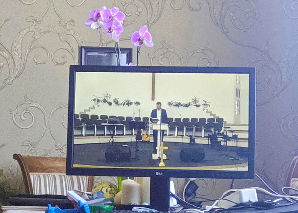 До начала прямой трансляции остается 10 минут. Стоя за камерой телефона моё волнение нарастает: не будет ли сбоев, не изменится ли звук (сегодня ведь братья принесли новый разъем для передачи звука на телефон), все-таки праздничное служение… все ли получится? Оборачиваюсь в зал – непривычная картина – секретарь, бухгалтер, один распорядитель, братья музыканты и пресвитеры... Таким небольшим составом за 5 минут до начала собираемся для общей молитвы перед служением.