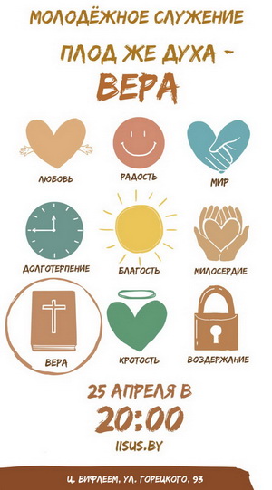 «Любовь, радость, мир, долготерпение, благость, милосердие, ВЕРА, кротость, воздержание» (Галатам 5:22-23).