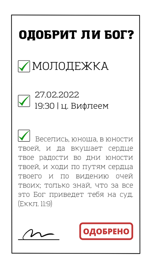 Приходи 27 февраля в 19:30 на молодежку «Одобрит ли Бог».